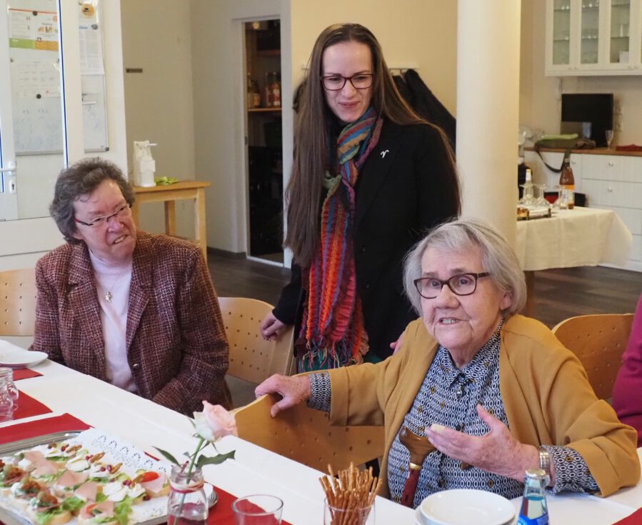 Waltraud Reichert, die erste ehrenamtliche Stadträtin Bad Vilbels, bei ihrem 95. Geburtstag. Mit auf dem Bild Evelyne Führer vom Vorstand der AWO Bad Vilbel (links) und die hauptamtliche Sozialdezernentin Ricarda Müller-Grimm (SPD) (c) Christine Fauerbach