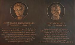 Nie wieder. Das ist jetzt! War die Maxime für Hannas Erinnerungsarbeit. Hierfür initiierte sie u.a. 30 Stolpersteine, darunter für den berühmten Arbeitsrechtler und Mitverfasser der Weimarer Verfassung Hugo Sinzheimer , und die Journalistin Martha Wertheimer, mit der sie sich jahrzehntelang beschäftigt und schließlich erreicht hat, dass mitten in Sachsenhausen ein Platz deren Namen trägt. Martha Wertheimer und Meta Quarck-Hammerschlag kannten sich aus dem gemeinsamen erfolgreichen Kampf der Frauenbewegung um das allgemeine, gleiche Wahlrecht für beide Geschlechter.